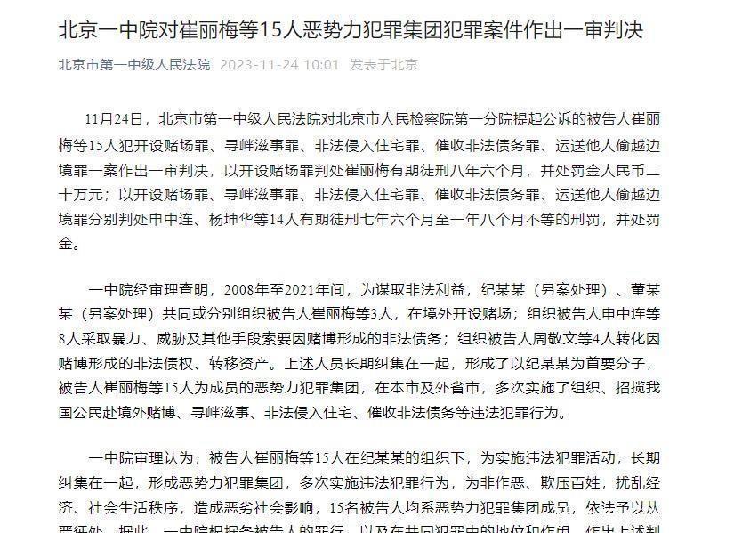 更劲爆的是,2023年北京法院通报,说以纪晓波为首的恶势力犯罪集团被打掉了。他妹妹崔丽梅被判八年半,其他十几个团伙成员也都进了监狱。法院明说了,这伙人长期组织内地人去境外赌博,还搞暴力催债、非法闯入别人家,影响特别坏。