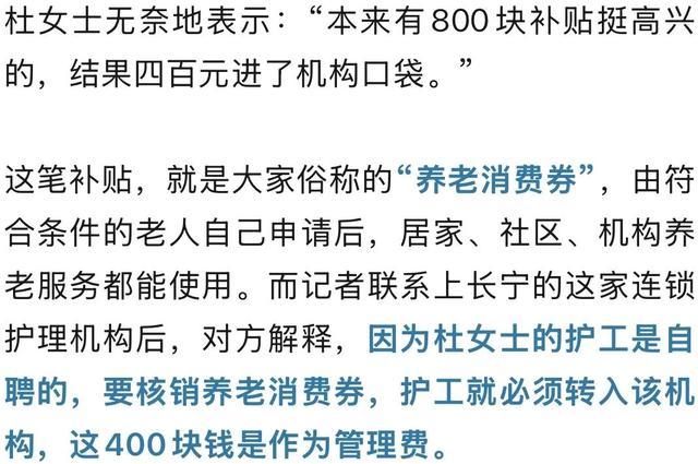 杨浦区民政局养老服务科工作人员明确表示:“机构收400元管理费,没有依据,我们从未指示过。800元补贴是老人个人使用的。”