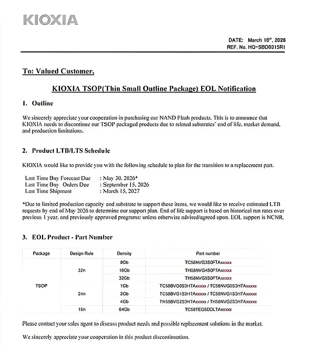 根据停产通知,此次涉及TSOP产品容量涵盖1Gb至64Gb(对应128MB至8GB),同时包含部分SLC(单层存储单元)、MLC(多层存储单元)存储产品。TSOP封装产品的最后下单截止日期为2026年9月15日,最后发货截止日期为2027年3月15日,留给下游客户的备货周期不足一年。